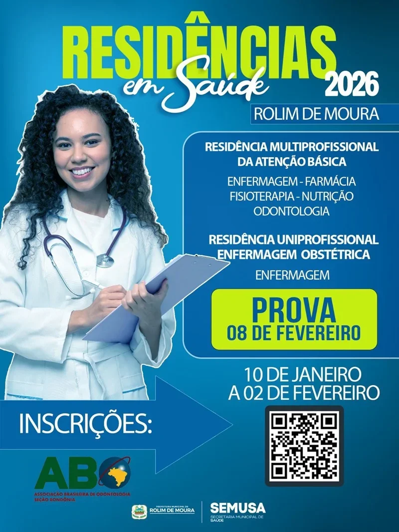 A Prefeitura de Rolim de Moura, através da Secretaria Municipal de Saúde (SEMUSA), publicou o Edital nº 01/2026, que abre vagas para Programas de Residência em Saúde, reforçando o compromisso com a qualificação de profissionais e o fortalecimento do Sistema Único de Saúde (SUS) no município e na região.