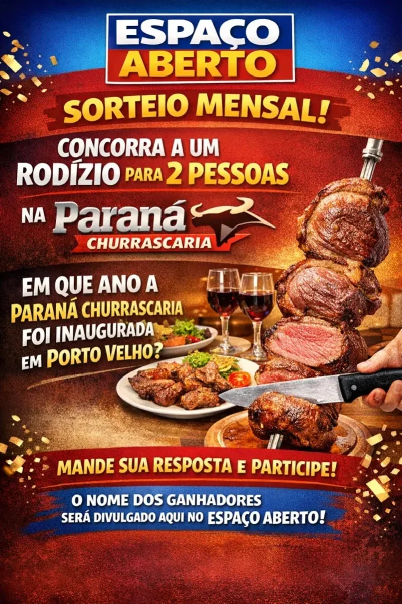 A partir de hoje o Espaço Aberto vai sortear mensalmente um rodízio para duas pessoas na excelente Paraná Churrascaria. Para participar do primeiro sorteio da promoção, basta apenas você mandar mensagem para coluna dizendo em que ano a Paraná churrascaria foi inaugurada em Porto Velho. O nome dos ganhadores será divulgado aqui mesmo no Espaço Aberto. Boa sorte!!