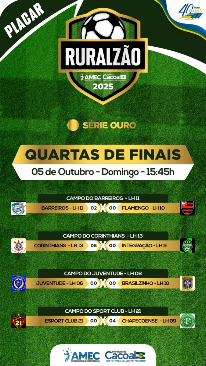 O fim de semana foi de emoção e grandes disputas nos campos da zona rural de Cacoal. Os jogos de ida das quartas de final do Ruralzão AMEC 2025 trouxeram goleadas expressivas, alguns jogos mais equilibrados e um público entusiasmado que foi a campo apoiar seus times. A competição, que neste ano celebra os 40 anos da Autarquia Municipal de Esporte e Cultura, segue consolidada como uma das principais vitrines do futebol amador da região.