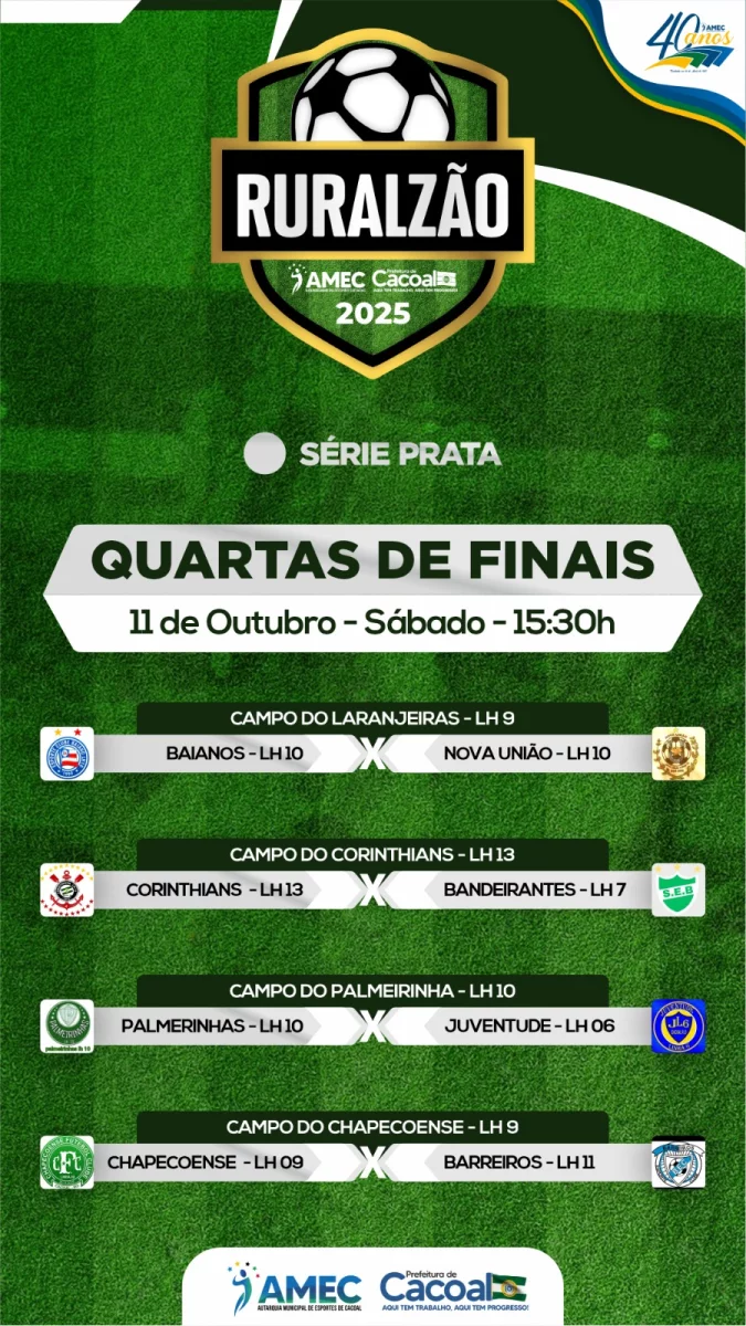 Da Redação (Cacoal, RO) – As decisões das quartas de final do Ruralzão Amec 2025 movimentam o futebol amador de Cacoal neste fim de semana. As partidas de volta das Séries Ouro e Prata vão definir as equipes que avançam às semifinais da competição, uma das mais tradicionais do calendário esportivo do município.