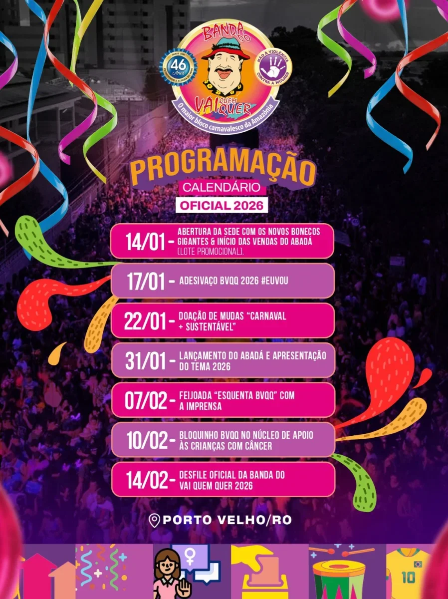 “A Banda do Vai Quem Quer já está pronta para entrar em campo com um calendário oficial de tirar o fôlego e muita festa para viver do começo ao fim. O grande desfile acontece no dia 14 de fevereiro, mas até lá tem ação, alegria, encontros e muita tradição para a gente celebrar junto. Marque na agenda e venha viver a melhor época do ano com a gente”, disse a presidente.
