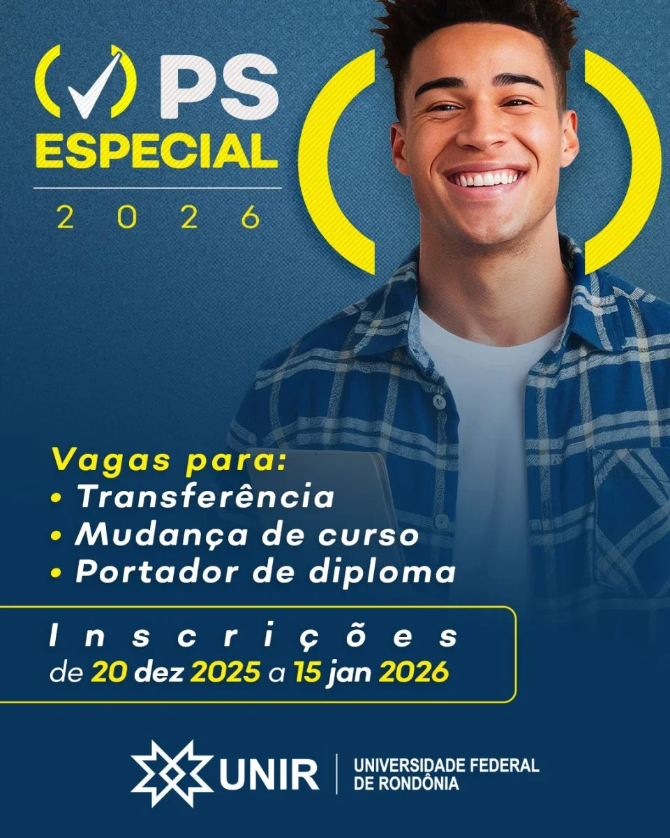 A Universidade Federal de Rondônia (UNIR) está na última semana de inscrições do Processo Seletivo Especial (PS Especial) 2026, destinado ao preenchimento de vagas ociosas nos cursos de graduação presenciais. As inscrições são gratuitas e seguem abertas até esta quinta-feira, dia 15 de janeiro de 2026, exclusivamente pelo sistema psespecial.unir.br.