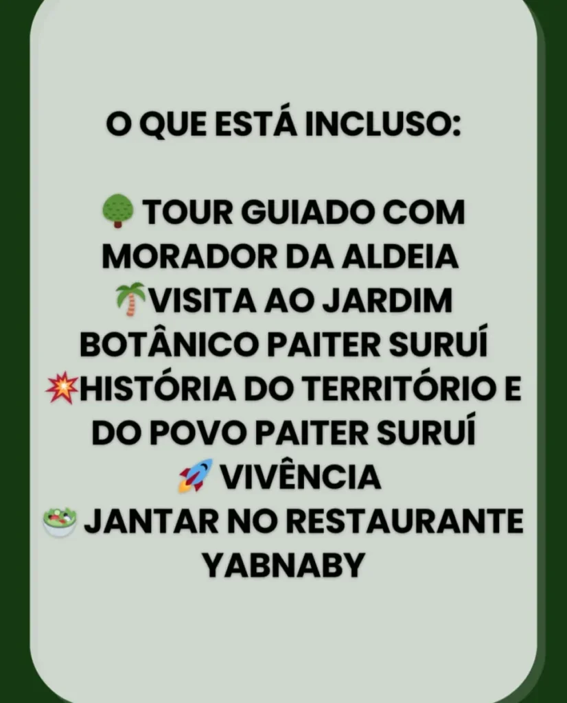 A atividade tem início às 15h30, com a chegada dos participantes ao espaço, que fica a cerca de 55 minutos do centro de Cacoal. A programação inclui um tour guiado com moradores da aldeia, visita ao Jardim Botânico Paiter Suruí, além de momentos de conversa cultural, onde os visitantes poderão conhecer mais sobre a história do território, tradições e o modo de vida indígena.
