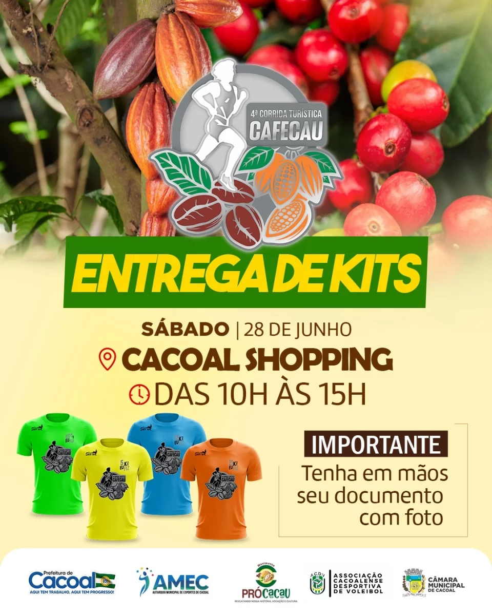 Neste sábado, 28 de junho, os atletas inscritos na 4ª Corrida Turística CAFECAU devem comparecer ao Cacoal Shopping, das 10h às 15h, para a retirada dos kits oficiais do evento.