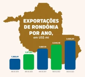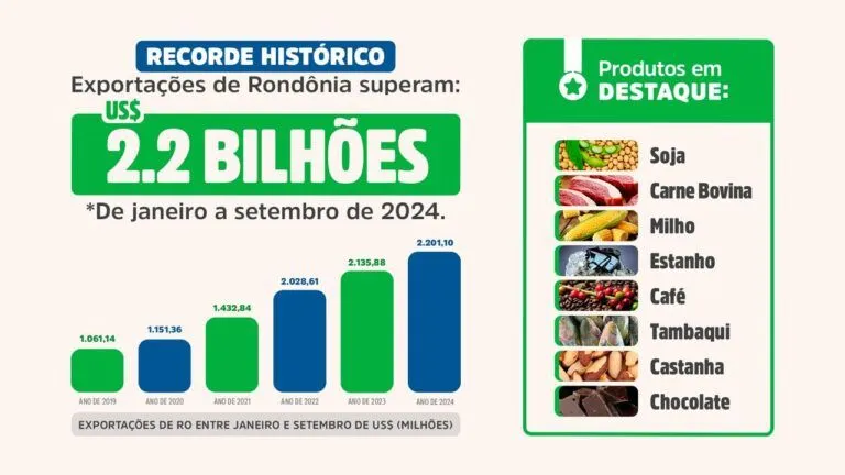 Rondônia alcançou recorde de exportação e está presente em 83 países, com 135 produtos. De janeiro a setembro de 2024, foram movimentados US$ 2,20 bilhões, o que equivale a R$ 12,72 bilhões. O valor é o maior que o registrado no mesmo período de 2023 (US$ 2,13 bi), e é o maior valor registrado em toda a série histórica, que começou a ser divulgada a partir de 1997. O levantamento é da Coordenação de Geointeligência de Dados Econômicos, vinculada à Secretaria de Estado Desenvolvimento Econômico (Sedec), com base nos dados do comércio exterior brasileiro: Comex Stat, e aponta uma evolução da evidência de Rondônia na segurança alimentar no mercado global.
