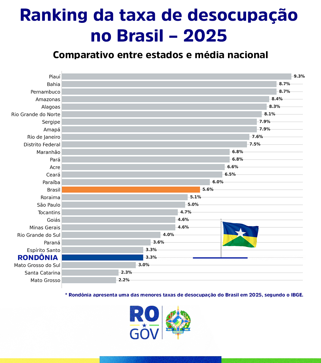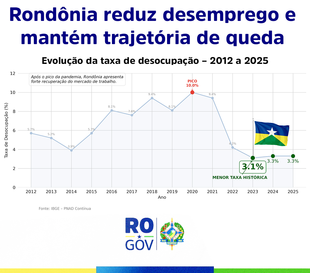 O desempenho de Rondônia é confirmado pelos levantamentos do Instituto Brasileiro de Geografia e Estatística (IBGE), que apontam trajetória consistente de queda da taxa de desocupação após o pico da pandemia, 10,0% em 2020; alcançando 3,1% em 2023 e mantendo-se em 3,3% em 2024 e 2025. No ranking nacional de 2025, o estado figura entre os melhores resultados do Brasil, com 3,3%, e apresentou, entre 2022 e 2025, presença constante entre o 1º, 2º, 3º e 4º lugares, incluindo o menor índice da série histórica trimestral do país, registrado no 3º trimestre de 2024, com 2,1%.